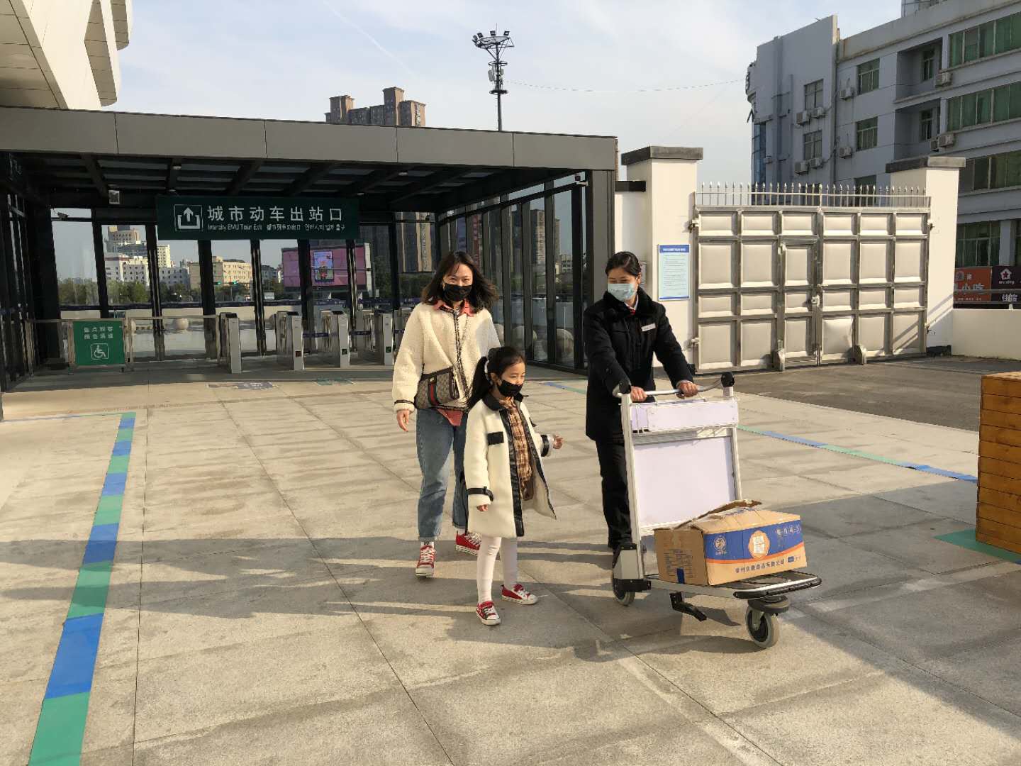 4月25日下午,乘坐第一班S3109的旅客大多数都是出行游玩的乘客。和往常一样,城市动车组的站务员们在各自的岗位上值守着,这时一位年轻的母亲带着三岁的孩童,怀里还抱着一个很沉的大纸箱很吃力,缓慢地往站台里走来。站务员刘倍倍赶忙上前接下她手中的大纸箱,减轻了她很大的负担。在她出示连易通二维码和进行完安检后,站务员韩雪和刘倍倍帮她把纸箱放在座位旁。车次开始检票时,站务员们将纸箱放在站内的行李推车上,刘倍倍将其一直送到车厢内。这位母亲连声道谢说:“太麻烦你们了,你们城市动车的服务真是太贴心了!”刘倍倍微笑的说:“能帮到您就是我们最开心的事情。”
