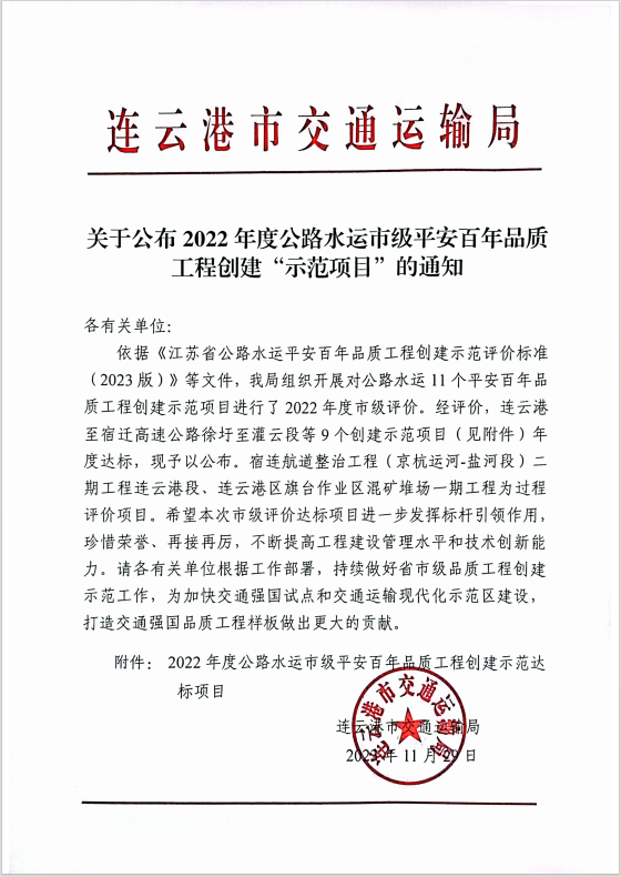 402省道赣榆南环段路基桥涵工程S402GYNH~SG2标段工程项目顺利通过2022年度公路水运市级平安百年品质工程“示范项目”。