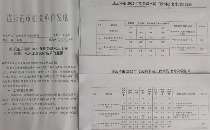 2023年2月至4月,市交通运输局组织开展了全市公路水运试验检测机构及全市范围内经备案的工地试验室钢筋、水泥比对试验,新丝路检测公司认真准备,积极参加,最终取得所有参数均为“满意”的成绩。