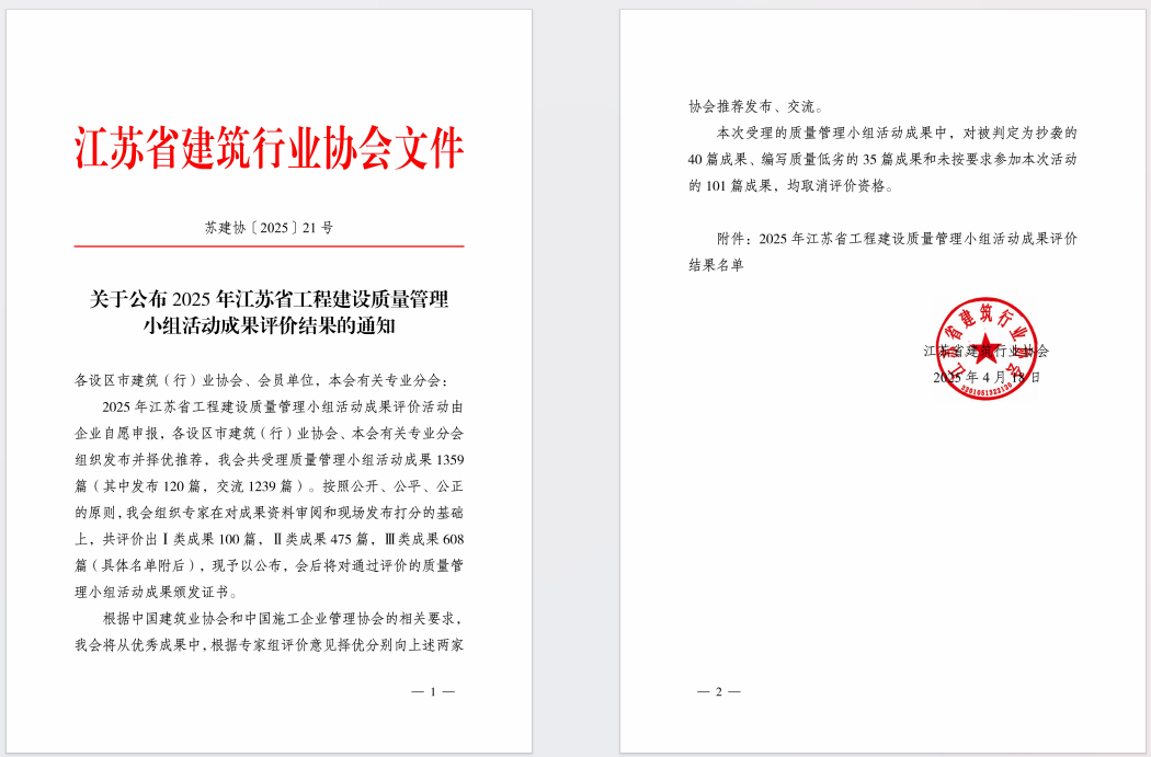 近日,江苏省建筑行业协会公布2025年江苏省工程建设质量管理小组活动成果评价结果,海建公司“只争朝夕”QC小组、“瀛洲南路”QC小组凭借成果《提高钢筋混凝土路面平整度验收合格率》及《提高桥梁花瓶墩钢筋保护层合格率》,在众多参赛小组中脱颖而出,分别荣获二类、三类成果奖。