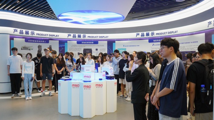 大学生们首先参观了海宏科技展厅,工作人员以展厅背景墙上的十二个字“智能改变世界 创新引领未来”为切入点,逐一介绍了公司的发展历程、主要产品、工业物联网及移动机器人、智能制造、高速数控凹版印花等内容。学子们纷纷围绕在展品周围,认真聆听讲解,并不时提出自己的疑问和见解,与讲解员进行热烈的互动。有的同学围绕自己的学习专业和对智能制造行业的认知与工作人员积极交流,就企业对大学生的专业需求,以及未来的学习成长、就业规划等问题有了更深刻地理解。