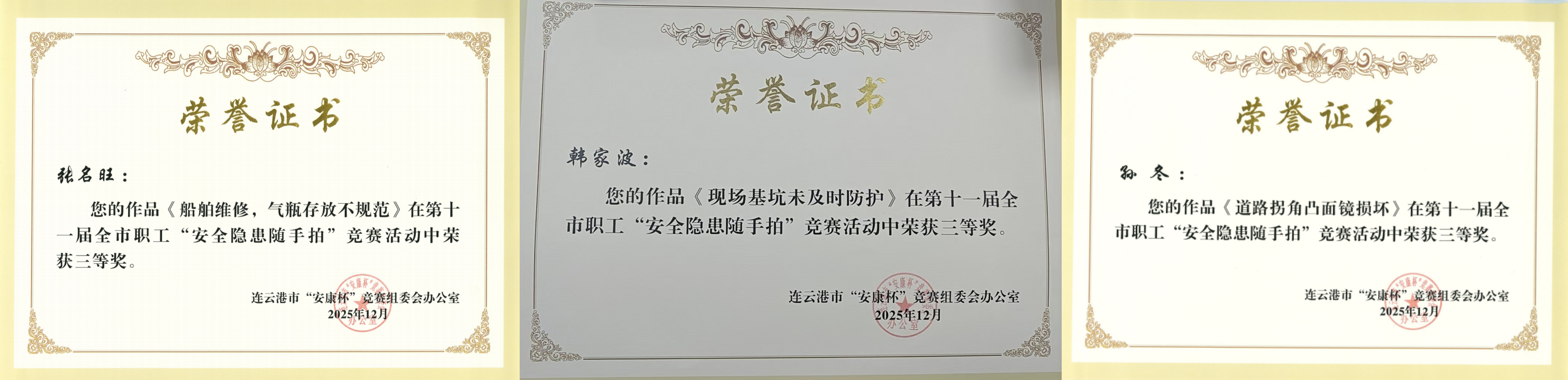 近日,连云港市“安康杯”竞赛组委会公布第十一届职工“安全隐患随手拍”竞赛结果,海建公司职工张名旺、孙冬、韩家波的作品荣获三等奖。