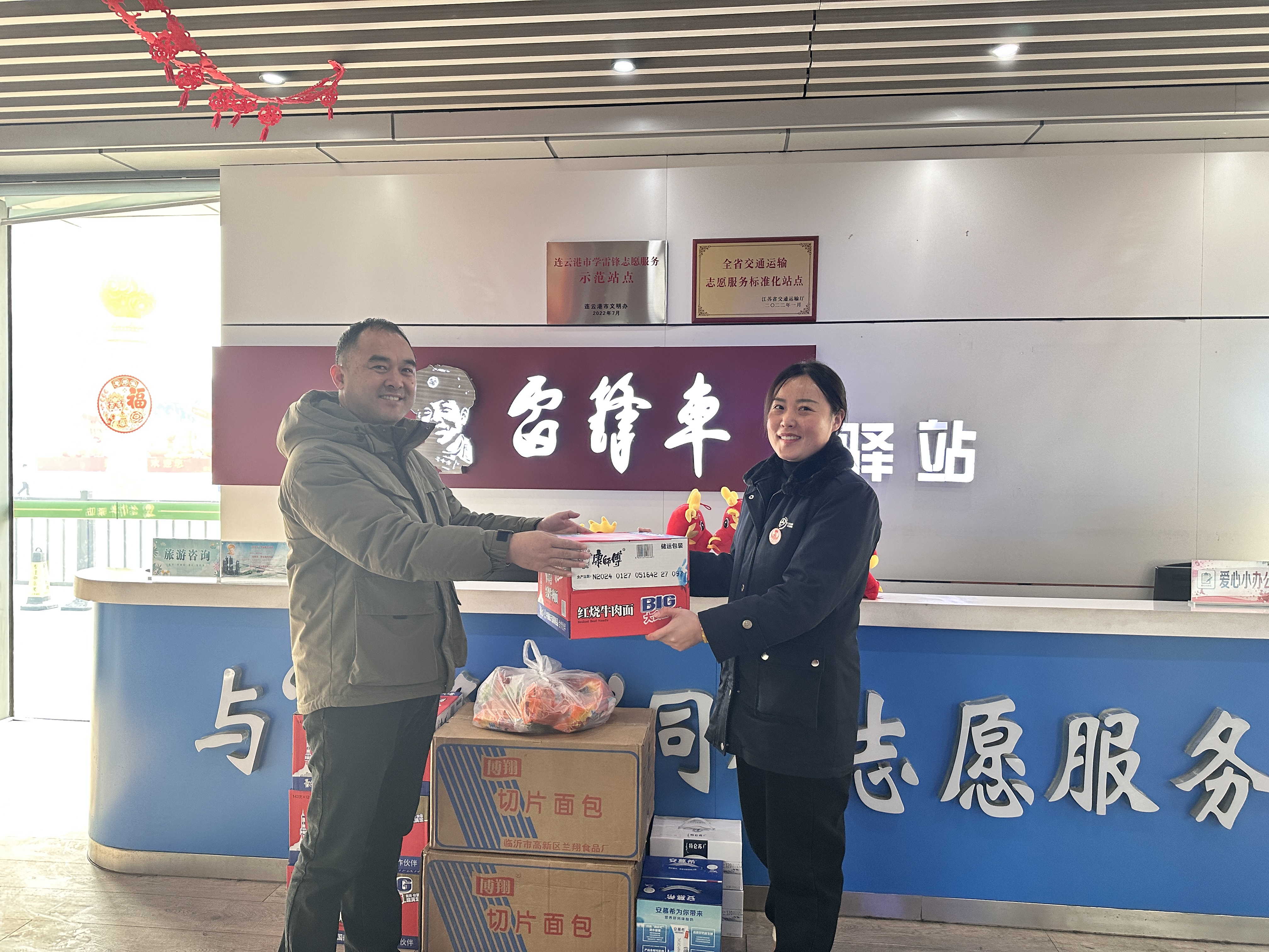 2月8日,在连云港市高铁站“雷锋车”驿站前,一抹抹“志愿红”随处可见,她们为假日客流高峰做好了准备。汽车公司工会为坚守在“雷锋车”驿站的“雷锋车”手们送上面包、牛奶等慰问品,为他们送去节日慰问与祝福。为应对客流高峰,春节假期“雷锋车”手志愿者们要连续奋战在高铁站,开展旅客帮扶、交通指引等工作。汽车公司副总经理、工会主席张春军表示:在春节出行客流高峰,“雷锋车”手们坚守岗位,无私奉献,不折不扣地落实公司的决策与部署,以群众所需为己任,温暖旅客回家路,展现了新时代“雷锋车”手的风采。