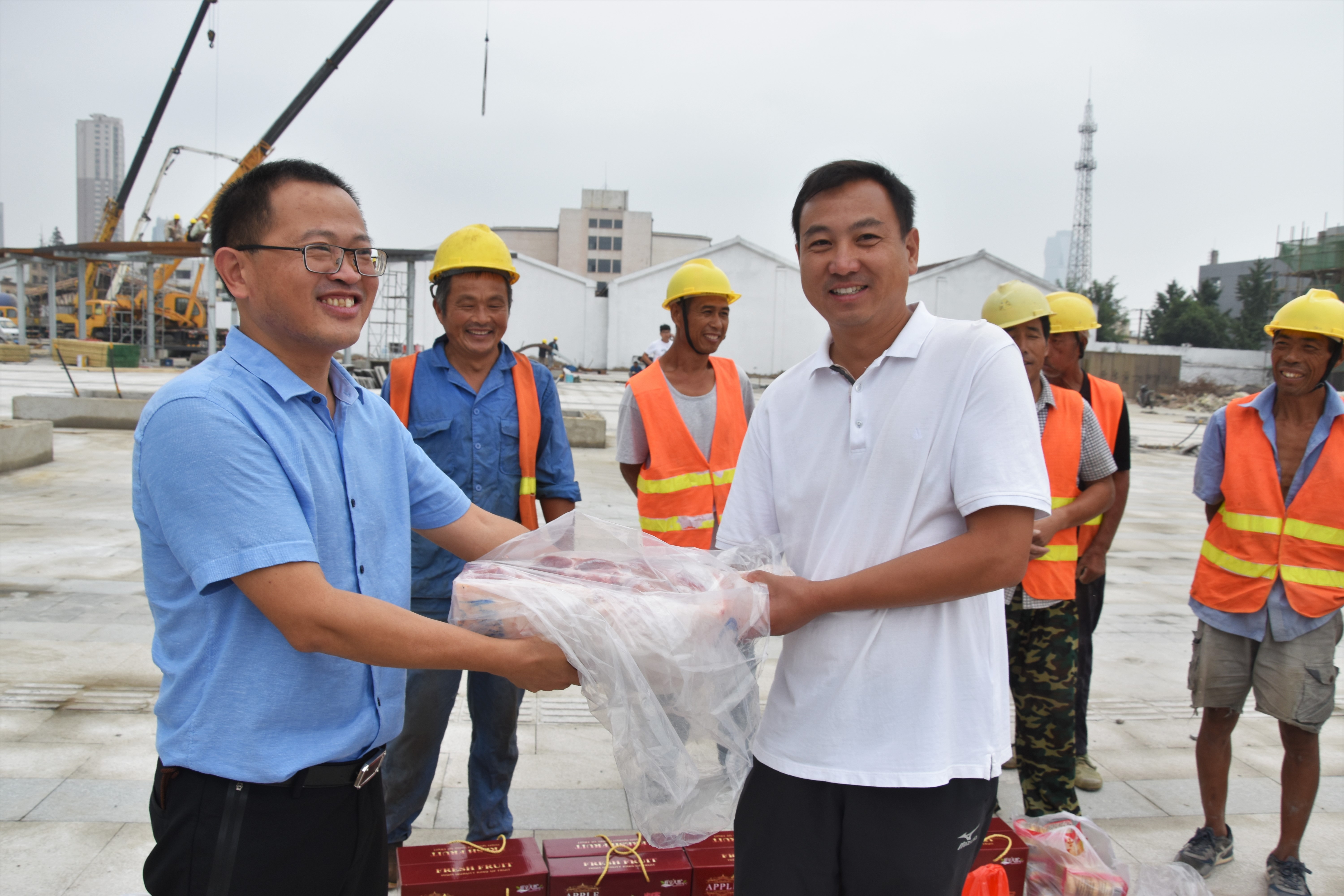中秋佳节将至,9月10日,市交通乐鱼手机版app-乐鱼(中国)领导及工会带着猪肉、活鱼、月饼、水果等,走访市域列车等交通重点工程建设工地,慰问和感谢广大施工人员将在工地度过中秋佳节。