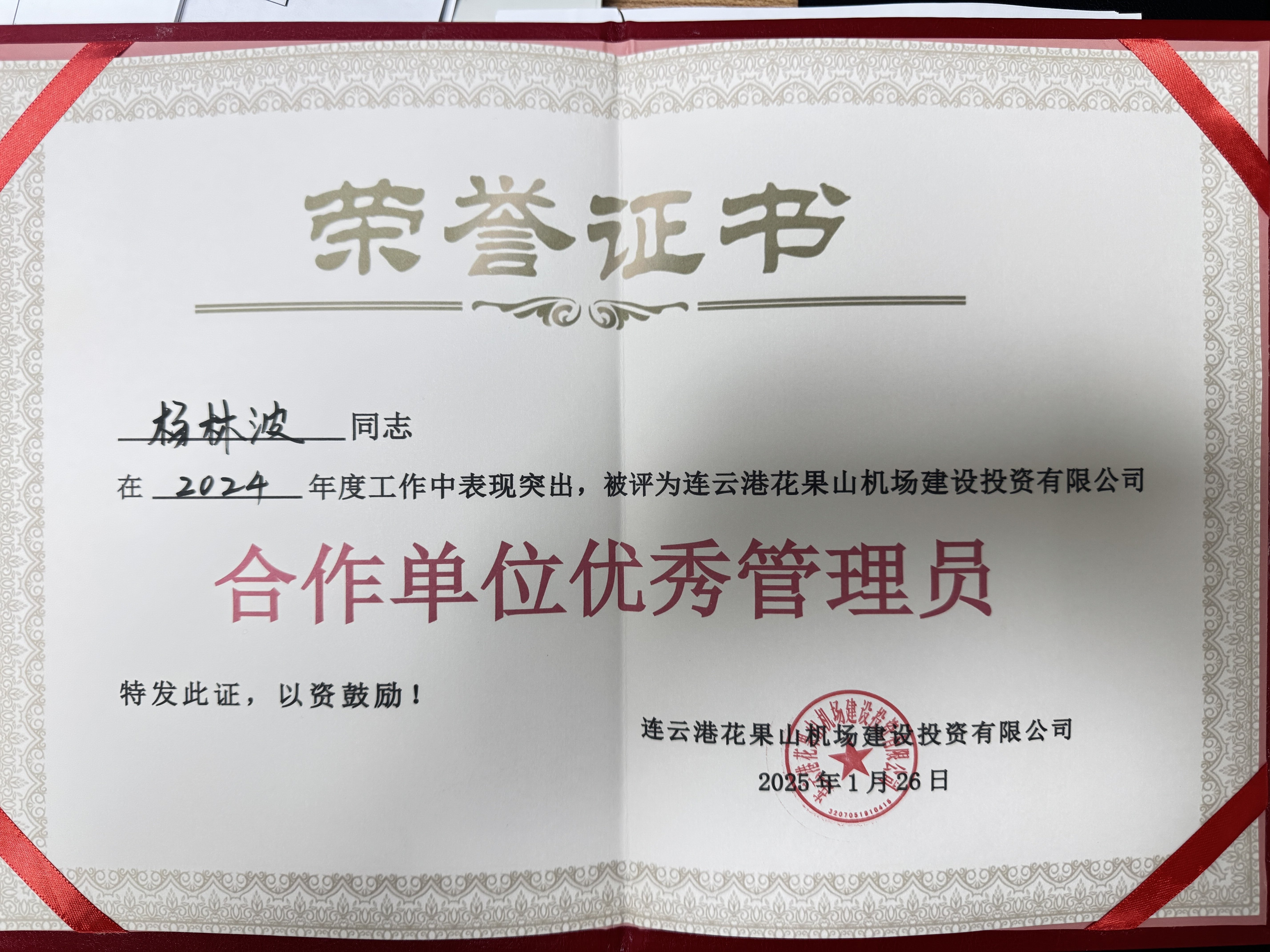 近日,连汽定制客运事业部机场班管理员杨林波凭借出色表现,荣获连云港花果山机场建设投资有限公司颁发的“合作单位优秀管理员”荣誉证书。这一荣誉不仅属于杨林波个人,更是对整个机场班团队优质服务与敬业精神的高度认可。