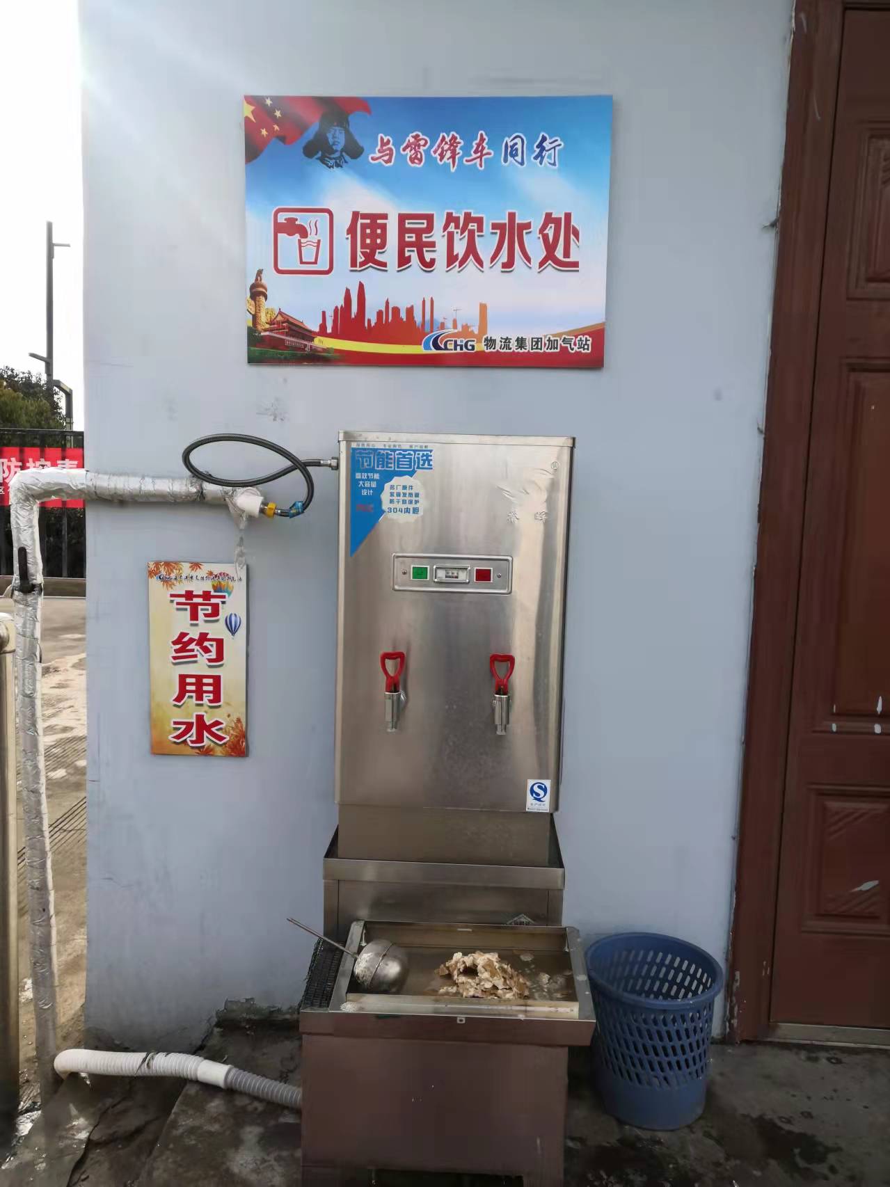 全年无休的便民饮水机,24小时随时待命,为辛勤工作的环卫工人、快递员和往来驾驶员师傅提供全天候免费茶水服务,让他们在寒冷的冬日感受到加气站给他们送上的一丝温暖!这是加气站党支部为民办实事中最有意义的一件,虽然加气站定期对便民饮水机进行清理,但由于长时间、不间断工作,水垢依然很厚。安全运营部人员关闭水阀和电路开关,更换浮球并张贴“维护清理中”通知。
