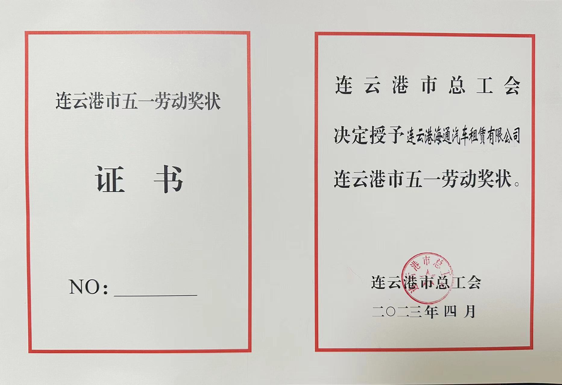 日前,从连云港市总工会传来喜讯,连云港海通汽车租赁有限公司荣获“连云港市五一劳动奖状”荣誉称号。