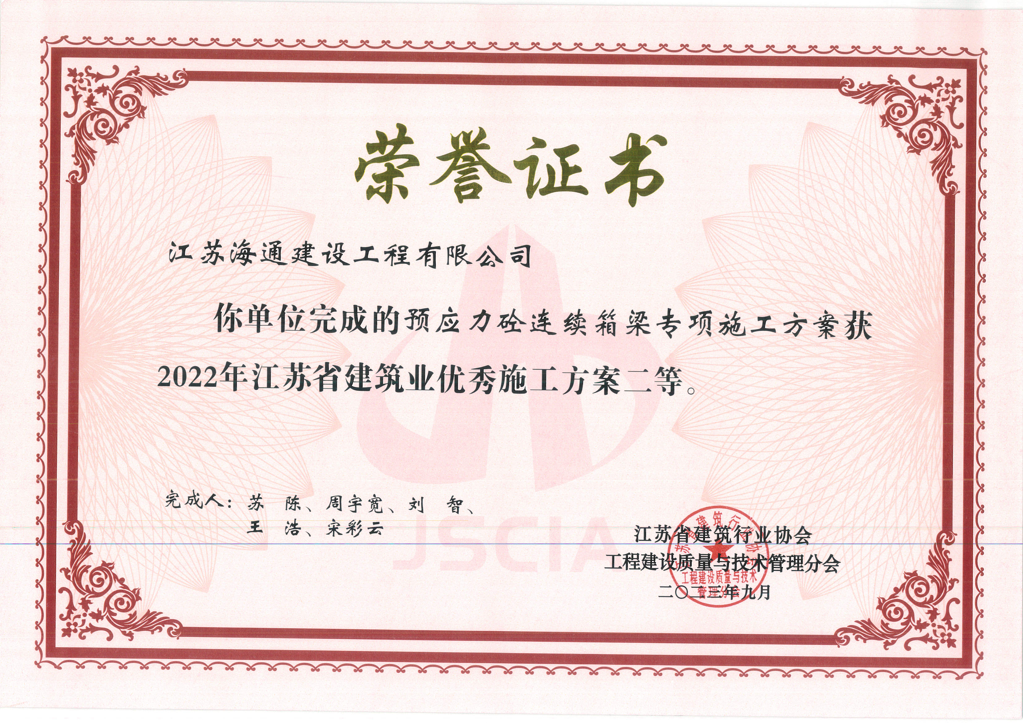 日前,从江苏省建筑业协会获悉,江苏海建公司申报的《预应力砼连续箱梁专项施工方案》和《二沉池、生物反应池基坑工程基坑支护工程土方开挖专项方案》两项施工方案分获江苏省建筑业优秀施工方案二等奖和三等奖。