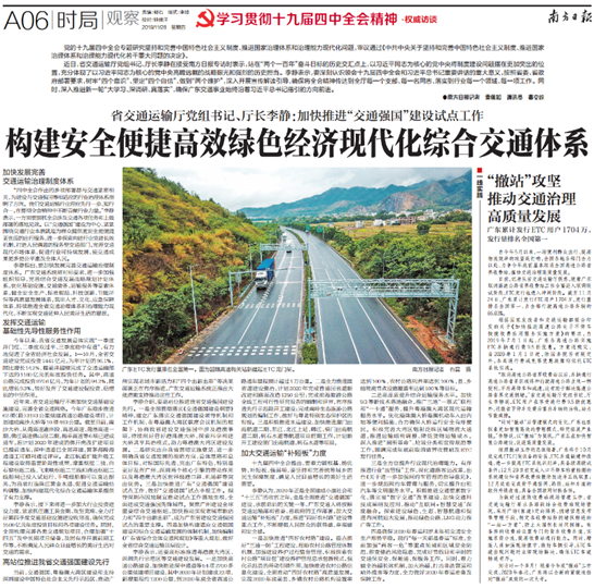 11 月28日,南方日报A06版刊登了对省交通运输厅党组书记、厅长李静的专访报道。李静表示,广东交通系统将深刻认识领会十九届四中全会和习近平总书记重要讲话的重大意义,按照省委、省政府部署要求,加快发展完善交通运输治理制度体系,高站位推进我省交通强国建设先行,加大交通运输“补短板”力度,构建安全便捷高效绿色经济的现代化综合交通体系。报道详情如下: