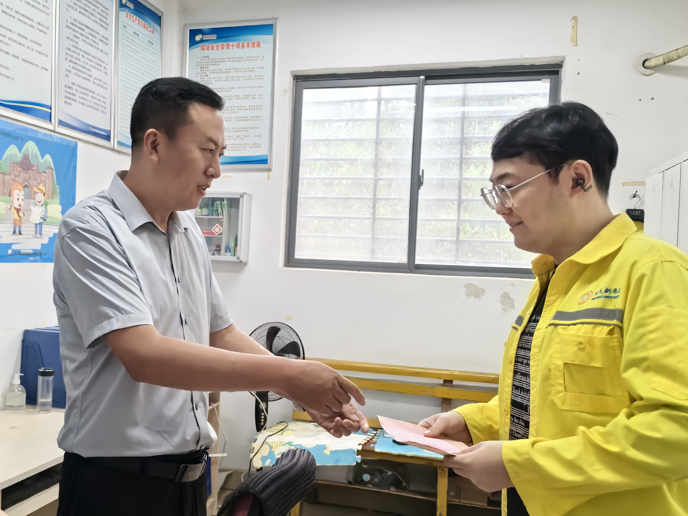 周辉一行首先前往中医院,在病榻前探望了仍在住院治疗的充电工孟宪强,关切地了解了他的恢复进展、治疗方案及生活需求,送上了满载祝福的慰问金和组织的殷切关怀。窗外雨声淅沥,病房内暖意融融。随后,慰问组赶赴了党校场站,探望了已返岗工作的充电工丁岚清。周辉在丁岚清的工位旁,细致询问了他因贫血住院后的康复状况及返岗后的身体适应情况,并亲手送上慰问金,叮嘱他务必保重身体,劳逸结合。一声声关切的叮嘱,一句句暖心的鼓励,让丁岚清、孟宪强深受感动,真切感受到“明茂大家庭”如家人般的温暖。