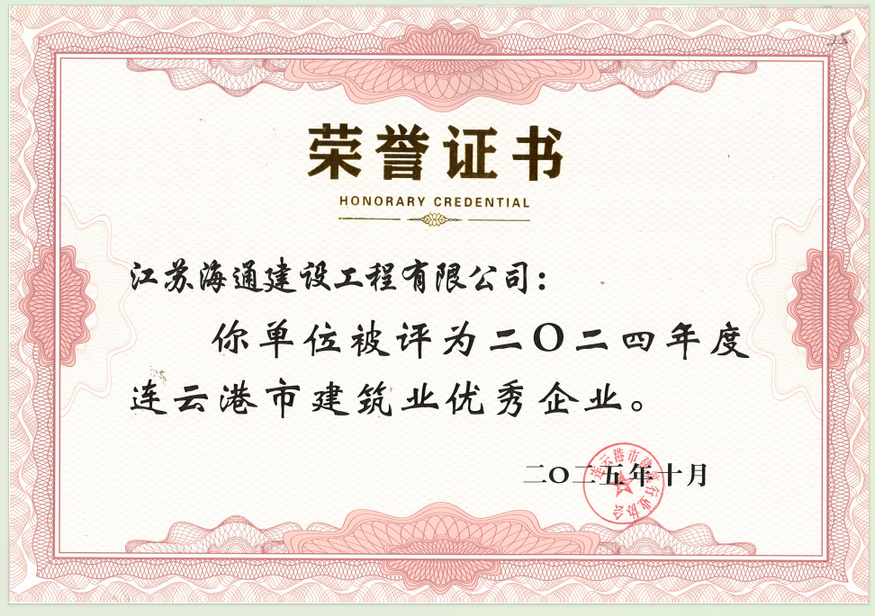 近日,连云港市建筑行业协会发布了2024年度建筑业优秀企业、优秀经理及优秀项目经理评价结果。江苏海通建设工程有限公司获评“2024年度连云港市建筑业优秀企业”,公司党委书记、董事长于振国同志获评“2024年度连云港市建筑业优秀经理”。