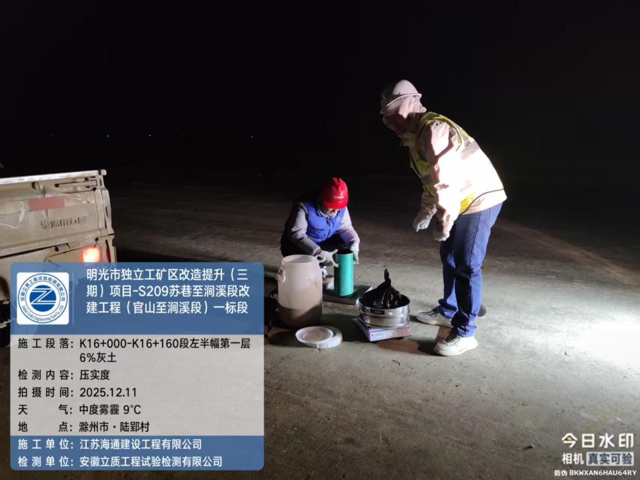 近日,江苏海建S209苏巷至涧溪段改建工程(官山至涧溪段)一标段项目部试验室连同第三方检测,组织对K16+000-K16-160左半幅第一层6%灰土压实度检测。