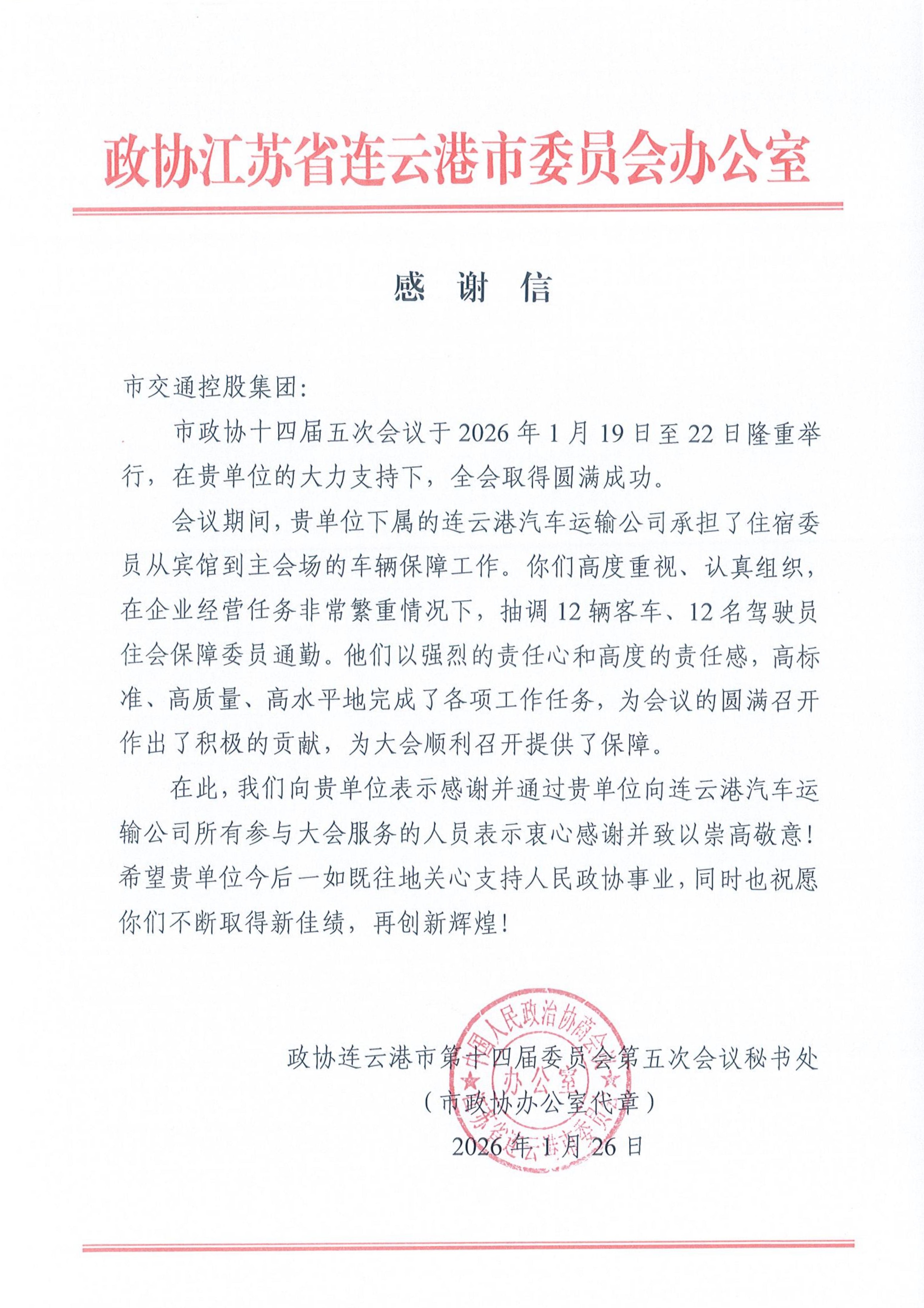 近日,连云港市交通控股乐鱼手机版app-乐鱼(中国)收到了连云港市政协的感谢信,对交通控股乐鱼手机版app-乐鱼(中国)和乐鱼手机版app-乐鱼(中国)权属连云港汽车运输有限公司在市政协十四届五次会议期间的组织保障工作给予了高度评价。