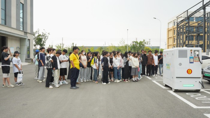 随后,学子们深入海宏科技生产车间观看充电移动机器人组装以及如何为新能源车辆充电的过程。透过透明的玻璃墙,他们看到了一群充满激情和创造力的工程师正在紧张地工作。这里的每一个实验室都像是一个知识的宝库,有的在对新型材料进行性能测试,有的在进行线路焊接。新能源车只需要停在车位上,扫描二维码,就会出现移动充电机器人小程序APP的用户端入口,输入车牌号,以及车位专属编码和预充金额,点击下单,公司运维管理SAAS云平台就接收到车主的订单信息,移动充电机器人就会接受指令自动驾驶到新能源车前的专属编码车位上,等移动充电机器人行驶到车位停止后,车主进行插枪,再点击小程序APP上的开始充电,移动充电机器人就会开始启枪为新能源车进行充电补能。研发部门的负责人热情地向学子们介绍了公司的研发理念和创新文化,鼓励他们在未来的学习和生活中勇于探索、敢于创新。