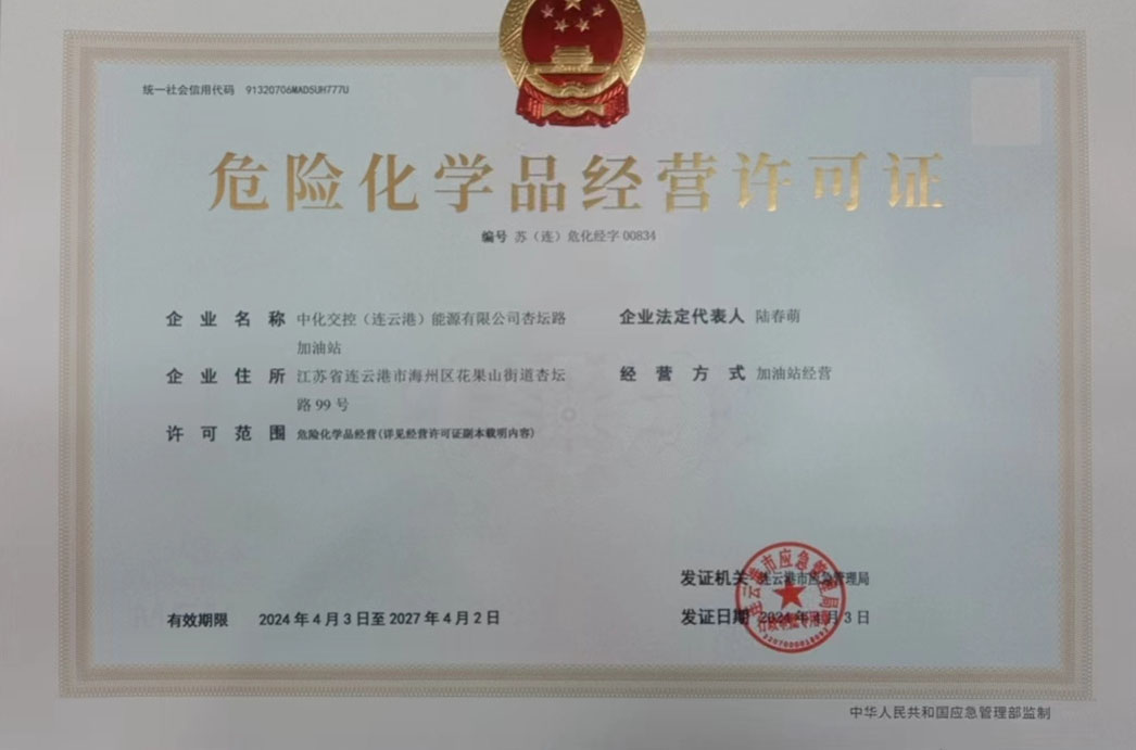 近日,经过各部门的通力协作,位于圣湖路北、杏坛路西的中化交控(连云港)能源有限公司杏坛路加油站顺利获取危险化学品经营许可证,此次许可证的顺利获批,标志着杏坛路加油站已具备合法经营危险化学品的资格,项目各项业务经营步入正轨。