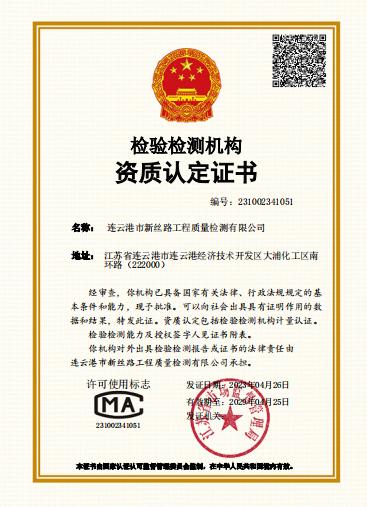 近日,江苏海建新丝路检测公司申报的检验检测机构资质认定,经江苏省市场监督管理局核准,换证成功并取得证书。