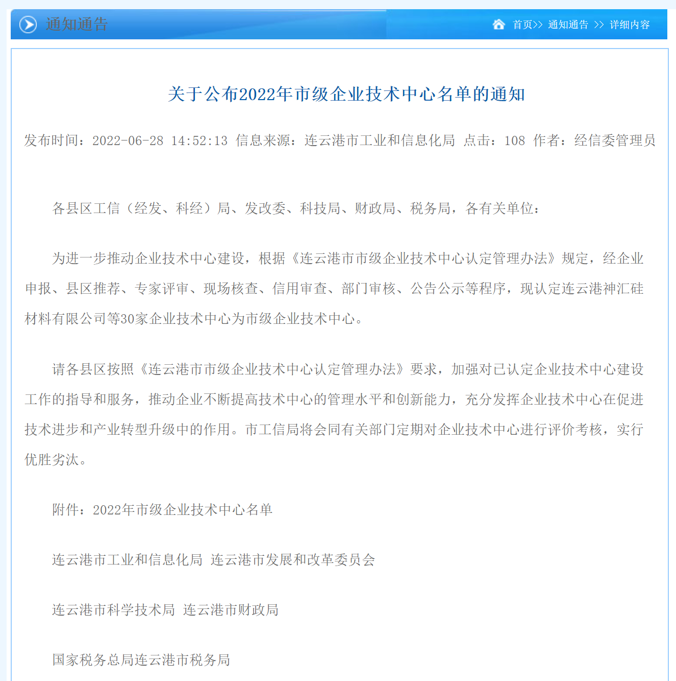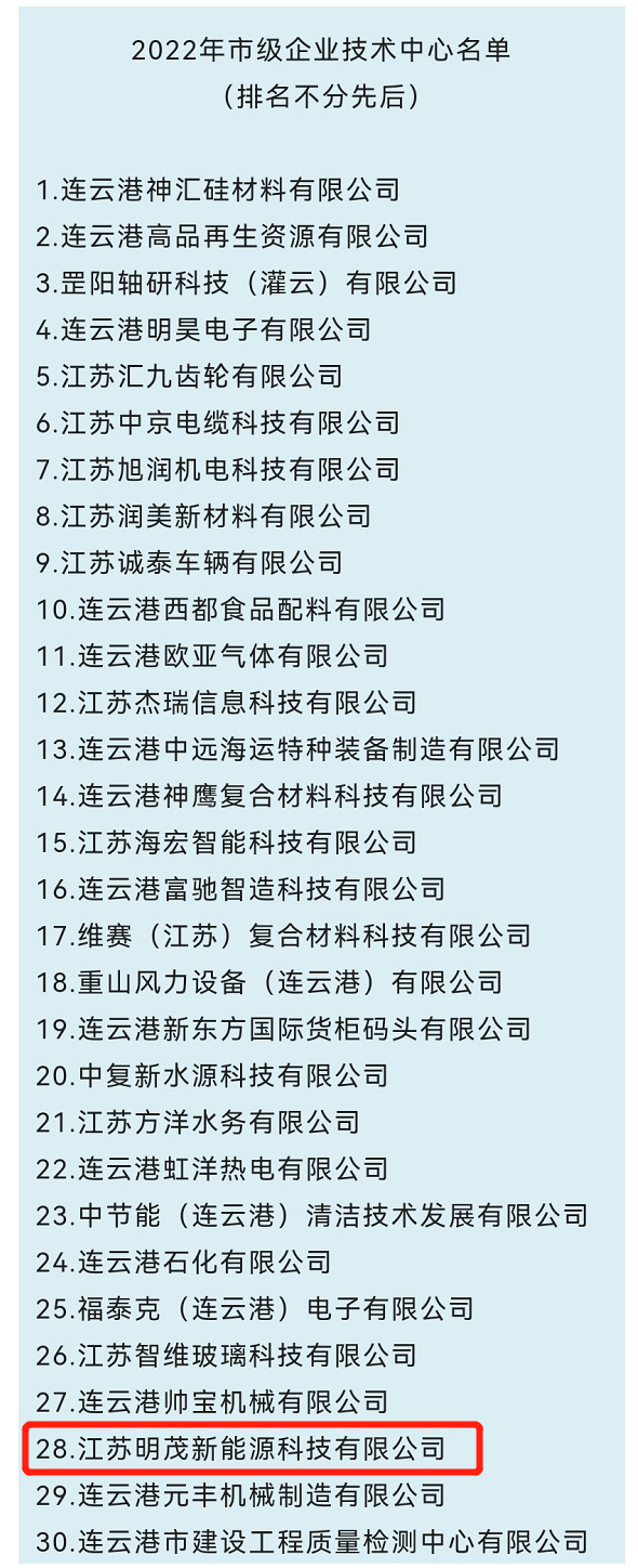 6月28日,连云港市工业和信息化局在官方网站发文,根据《连云港市认定企业技术中心管理办法》,认定明茂公司为2022年连云港市企业技术中心。