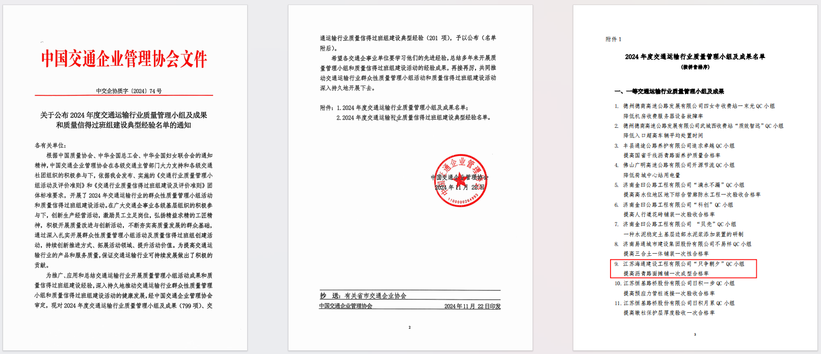近日,据中交企协质字〔2024〕74号文《关于公布2024年度交通运输行业质量管理小组及成果和质量信得过班组建设典型经验名单的通知》,江苏海建公司只争朝夕QC小组及其成果《提高沥青路面摊铺一次成型合格率》被评为2024年度交通运输行业质量管理小组及成果一等奖。
