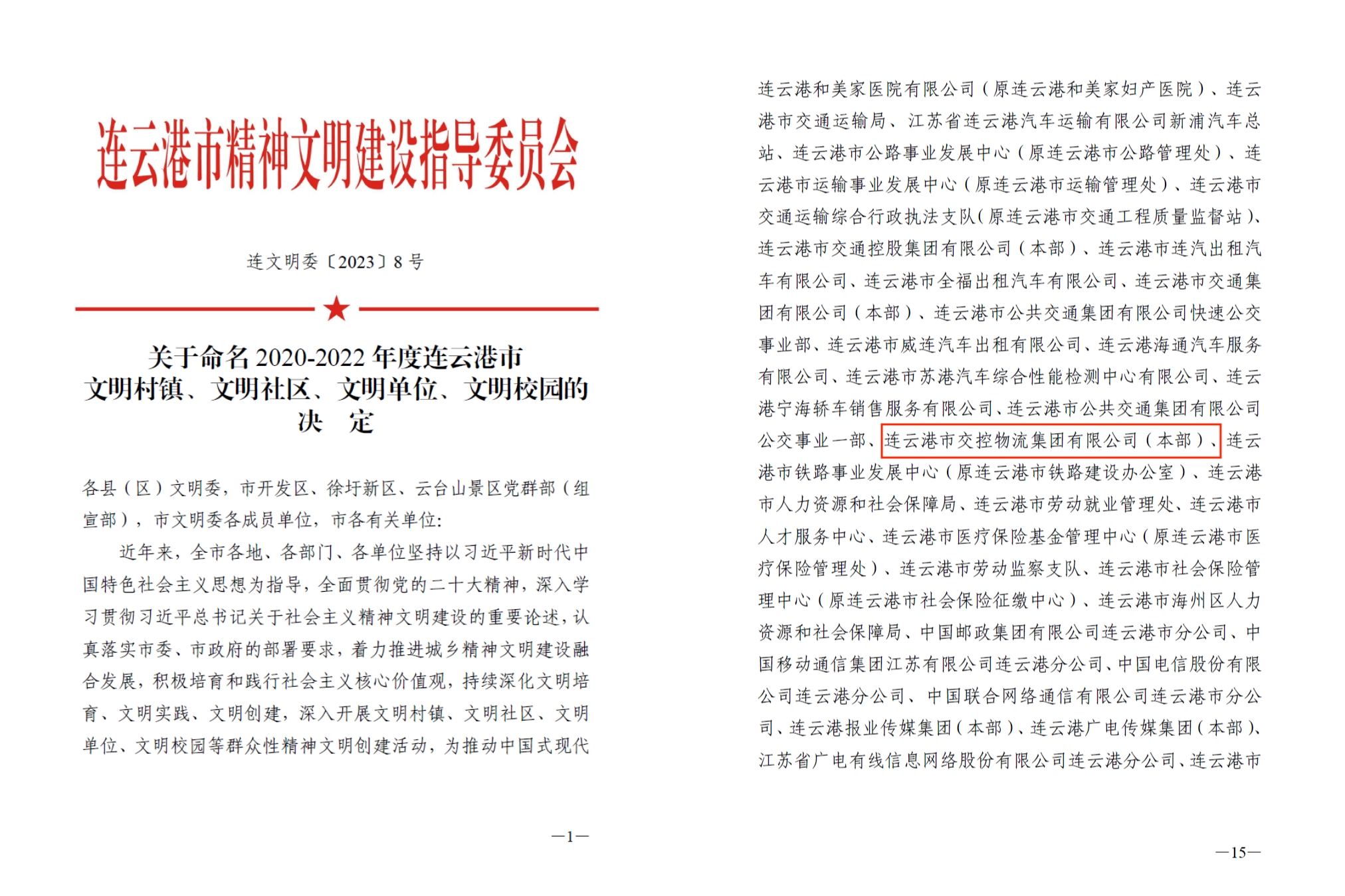 经申报、网上审核、现场审查等一系列流程,物流乐鱼手机版app-乐鱼(中国)顺利通过了2020-2022年度连云港市文明单位测评,并于12月27日收到由连云港市精神文明建设指导委员会印发的《连文明委〔2023〕8号《关于命名2020-2022年度连云港市文明单位的决定》》文件。
