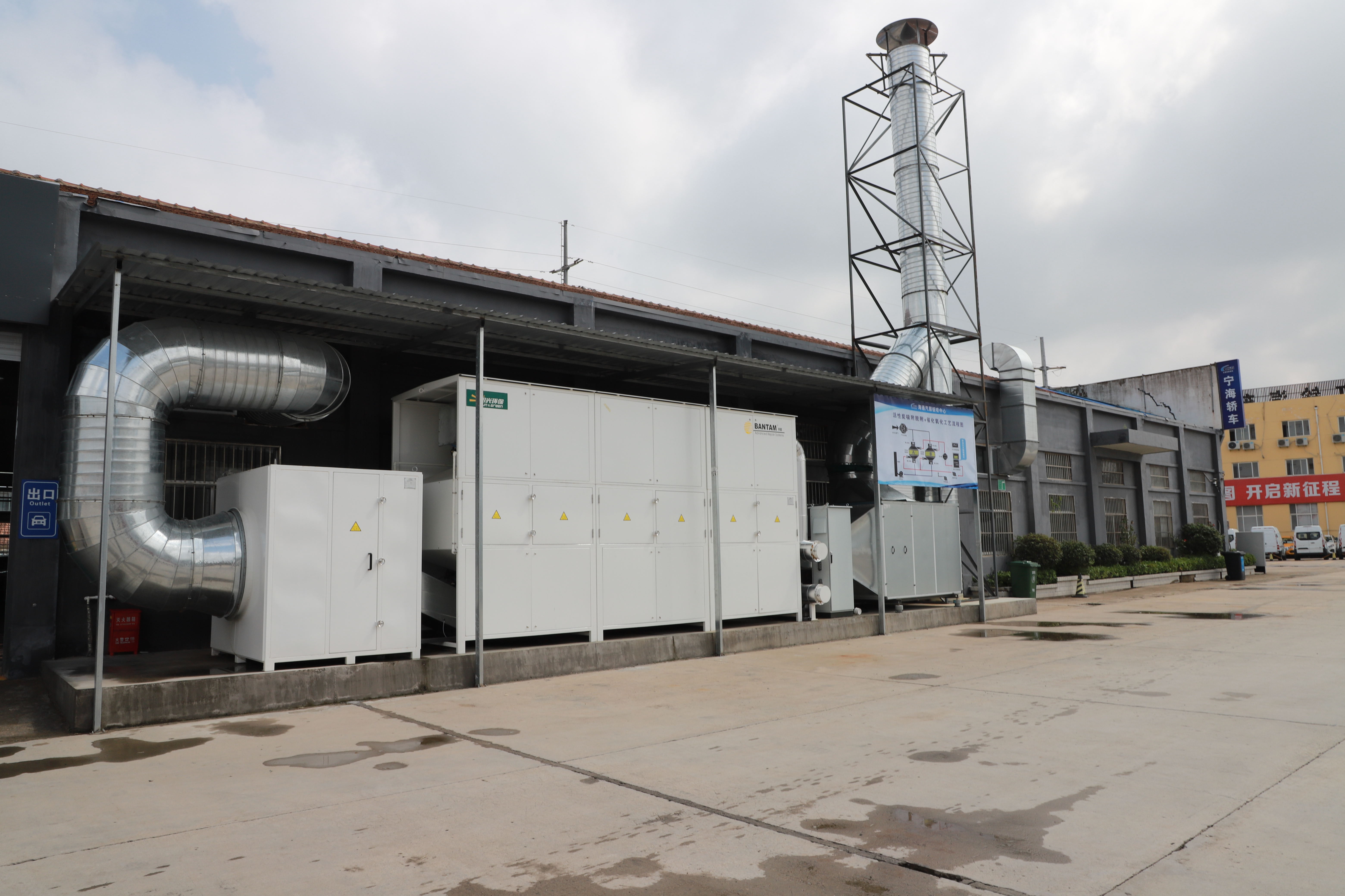 海通汽服公司投入资金100余万元,将原宁海公司汽车修理厂改建成我市首家绿色环保汽车钣喷服务中心,占地面积约1500平米,拥有13个作业工位,设计年产能24000板面,维修车辆可达6000台次。设置2间烤漆房、2间快烤房、3间打磨间,环保设施由清华大学环境学院参与设计安装,建成钣喷“绿岛”。喷烤漆房废气治理采用的活性炭吸附+共享催化氧化的高效处理技术,活性炭饱和后的脱附再生通过“移动脱附车”完成,实现了废气处理设施的可持续运行。对于汽车喷漆、烤漆产生的废气去除效率高于95%,每年可减少挥发性有机物(VOCs)排放量约11.4吨。