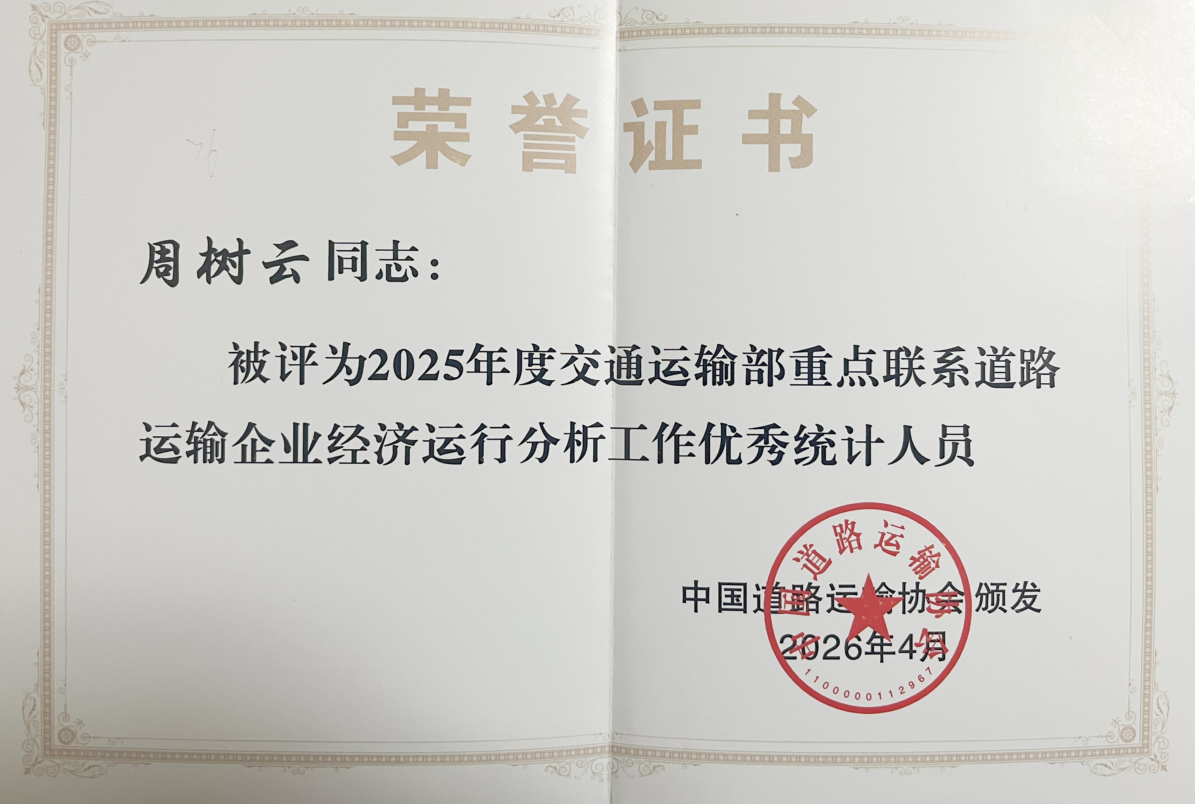 近日,中国道路运输协会在重庆市组织召开了“2026年交通运输部重点联系道路运输企业暨道路旅客运输经济运行动态监测机制工作会议”。会议通报表扬2025年度统计工作表现突出的单位和优秀统计人员,汽车公司获评“2025年度交通运输部重点联系道路运输企业经济运行分析工作先进单位”,汽车公司周树云同志获评“2025年度交通运输部重点联系道路运输企业经济运行分析工作优秀统计人员”。