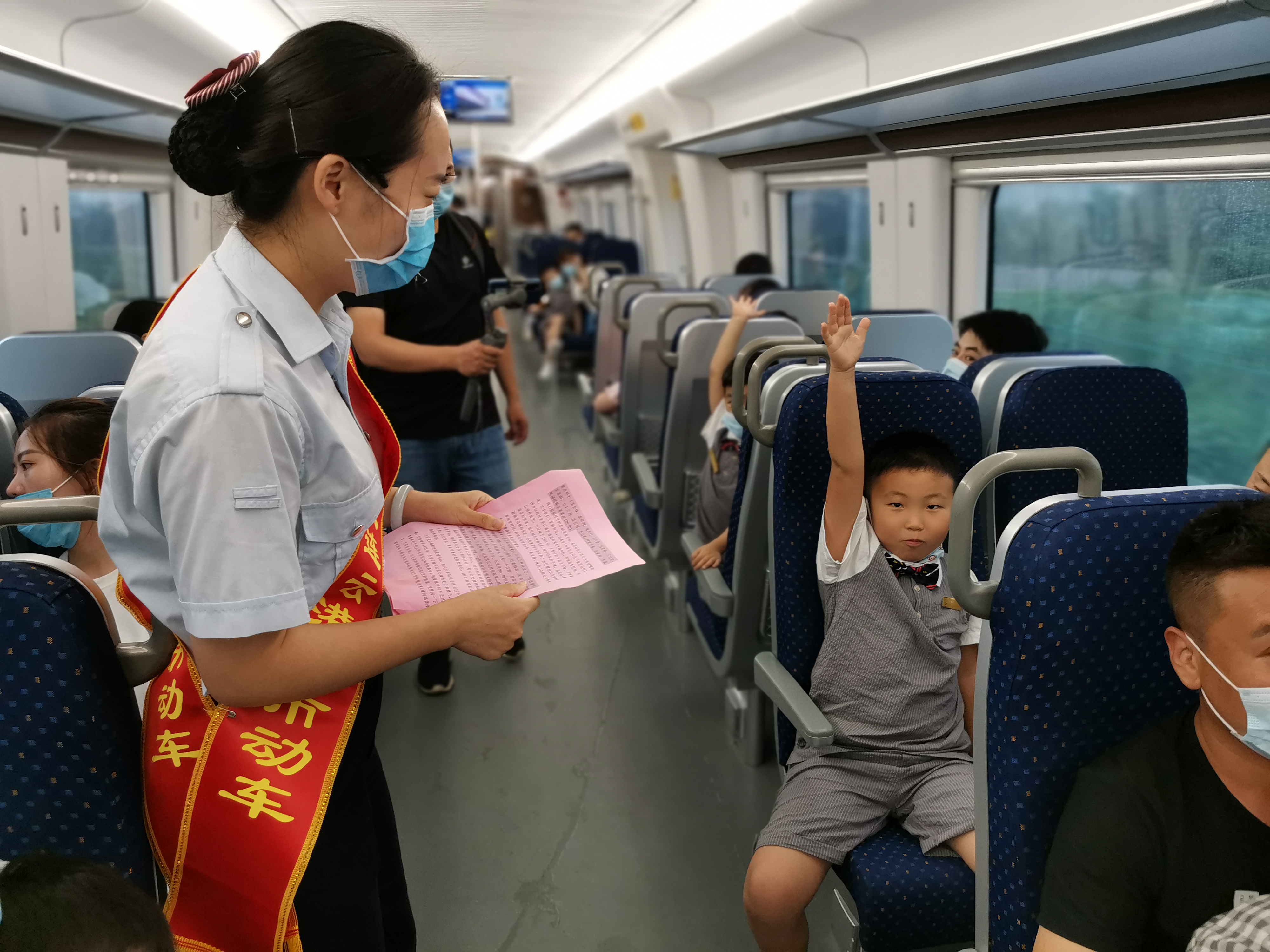 途中城市动车的工作人员向小记者们讲解了关于城市动车的背景、外观设计理念、沿途站点情况、安全乘车知识以及文明乘车准则等,吸引着孩子们学习知识和讨论兴趣。当讲解员讲到关于哪些是属于城市动车的禁带品和危险品时,通过现场提问的形式和小记者们进行互动,小记者们积极举手发言,并对有一些容易忽略的禁带品提出疑问,讲解员一一作出了解答。行车途中,讲解员还和小记者们一起讨论了轨道沿线两边城市环境的发展和变化,并对城市未来的发展进行了展望。活动结束时,一名小记者说到:“这次活动让我学到了许多课外知识,开阔了眼界,也受到了城市动车的所有工作人员的热情接待,我为你们点赞!”。