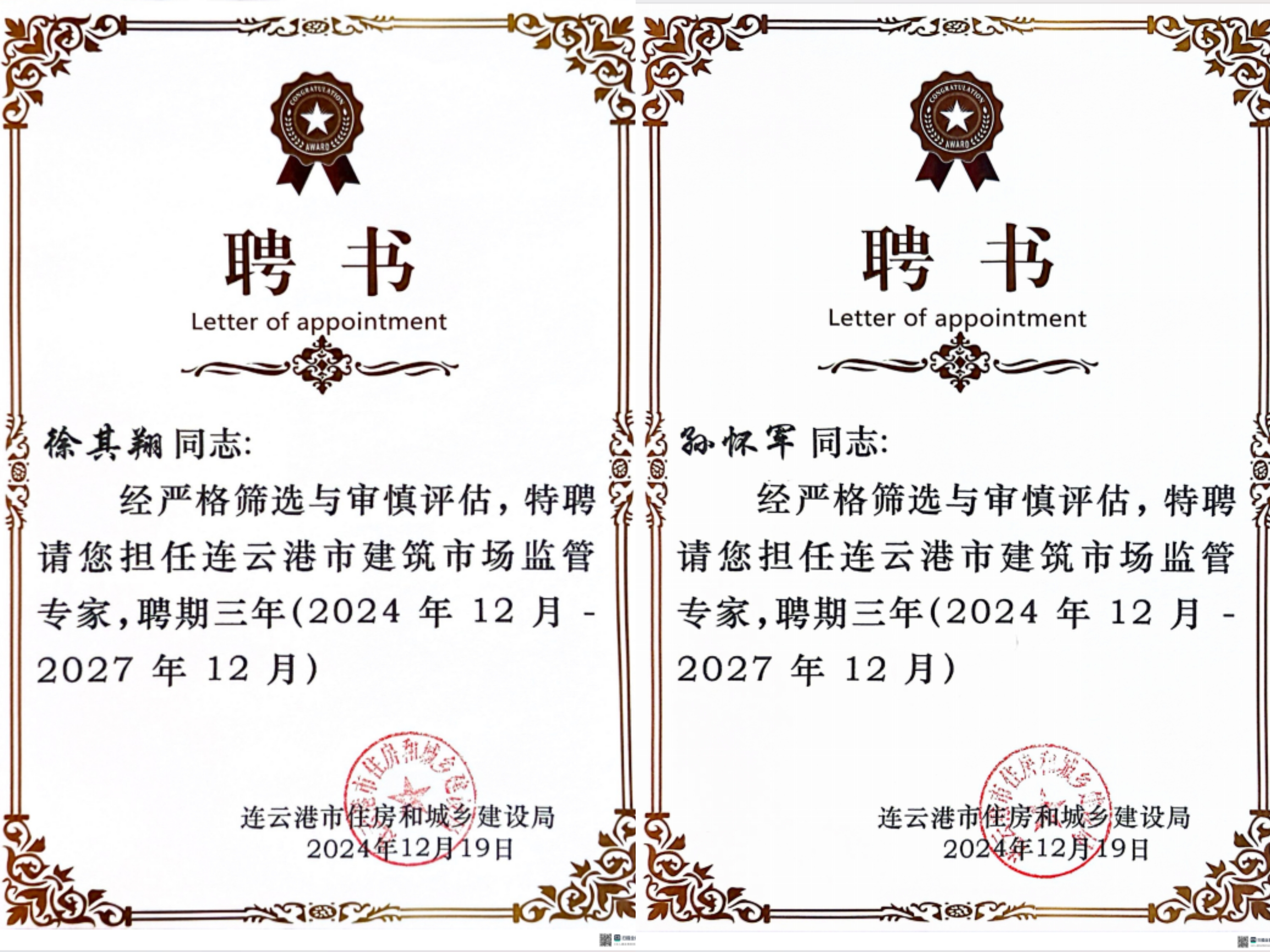 连云港市建筑市场监管及造价管理专家库由市建筑行业协会与市造价站等组织申报推荐,旨在进一步规范全市建筑市场秩序,加大建筑市场违法违规行为的打击力度,更好发挥专家技术支撑作用,为化解建筑市场矛盾和造价纠纷提供建议、咨询。长期以来,江苏海建公司高度重视专业人才培养与行业资源整合,此次积极响应专家库选拔号召,通过内部严格筛选与专业推荐,最终徐其翔、孙怀军凭借扎实的专业能力与丰富的行业经验成功入选。这一成果不仅彰显公司在建筑市场监管领域的人才储备优势,更体现企业主动服务行业发展大局的责任担当。